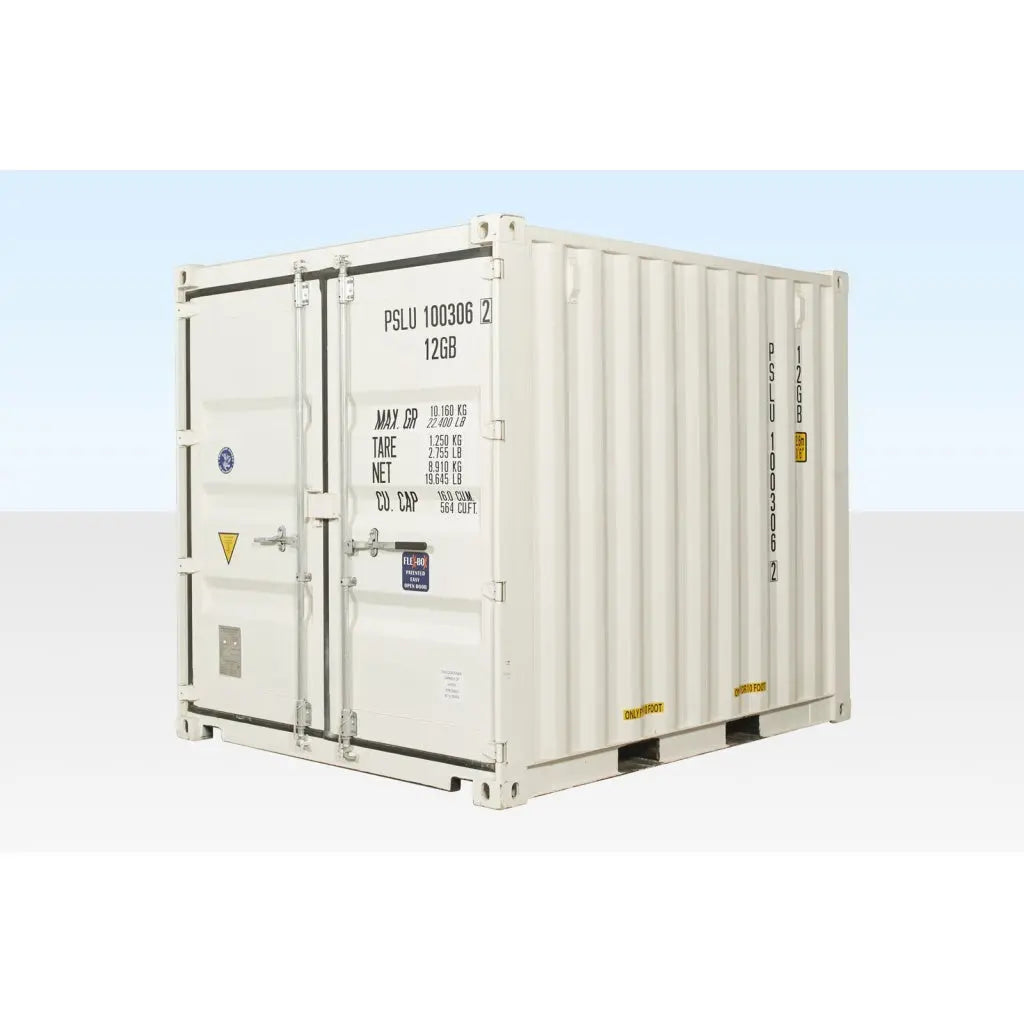 Nuevo contenedor de envío estándar de 10 pies x 8 pies disponible para la venta en blanco.