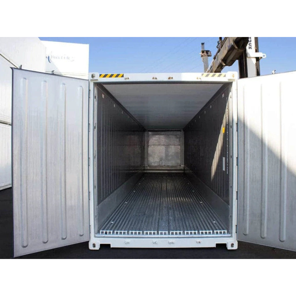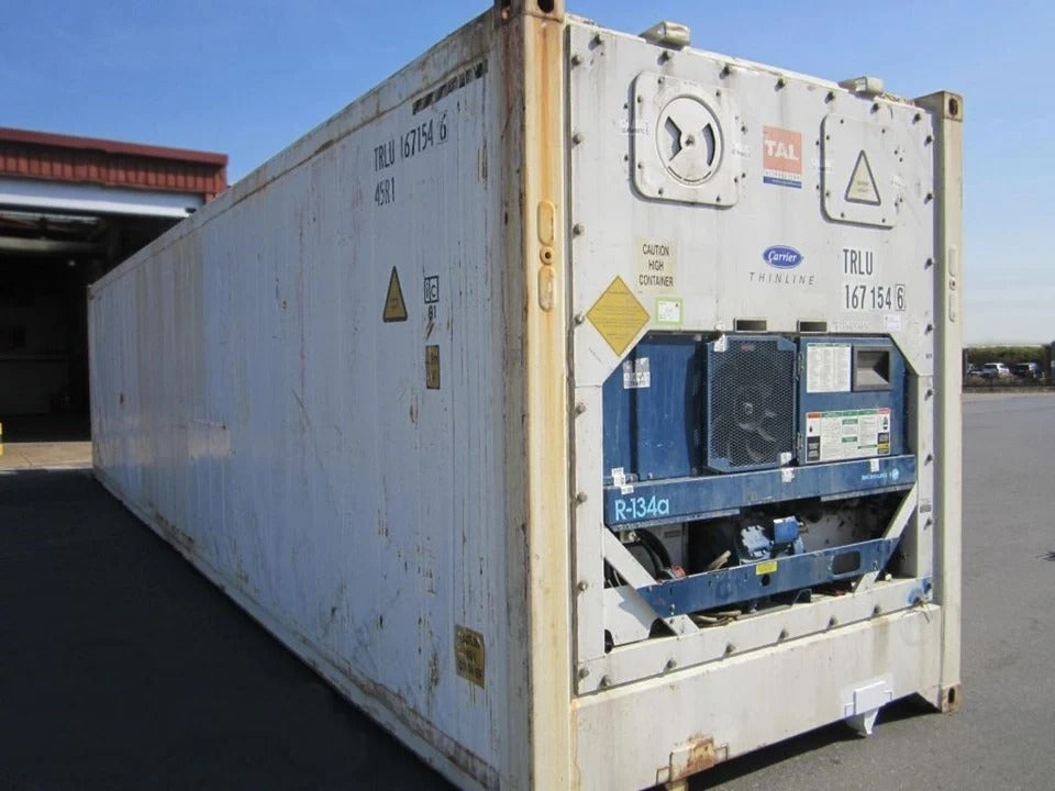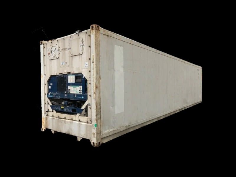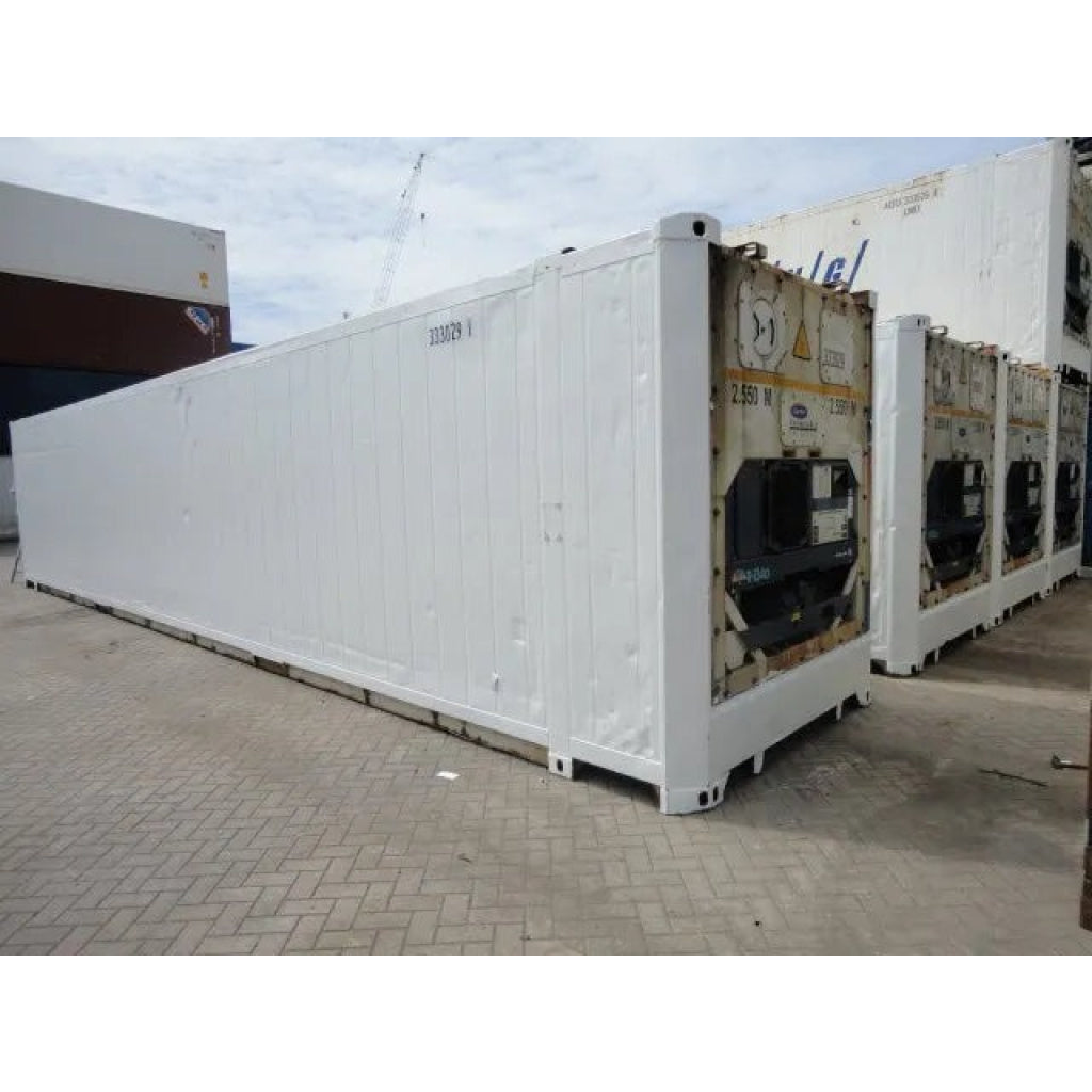 Contenedor marítimo refrigerado High Cube de 40 pies usado. 67,5 m³ de almacenamiento refrigerado. Equipado con unidad de refrigeración para almacenamiento a temperatura controlada de -25°C a +25°C. Unidad de refrigeración revisada. Totalmente estanco. Integridad estructural correcta. Placa CSC válida.